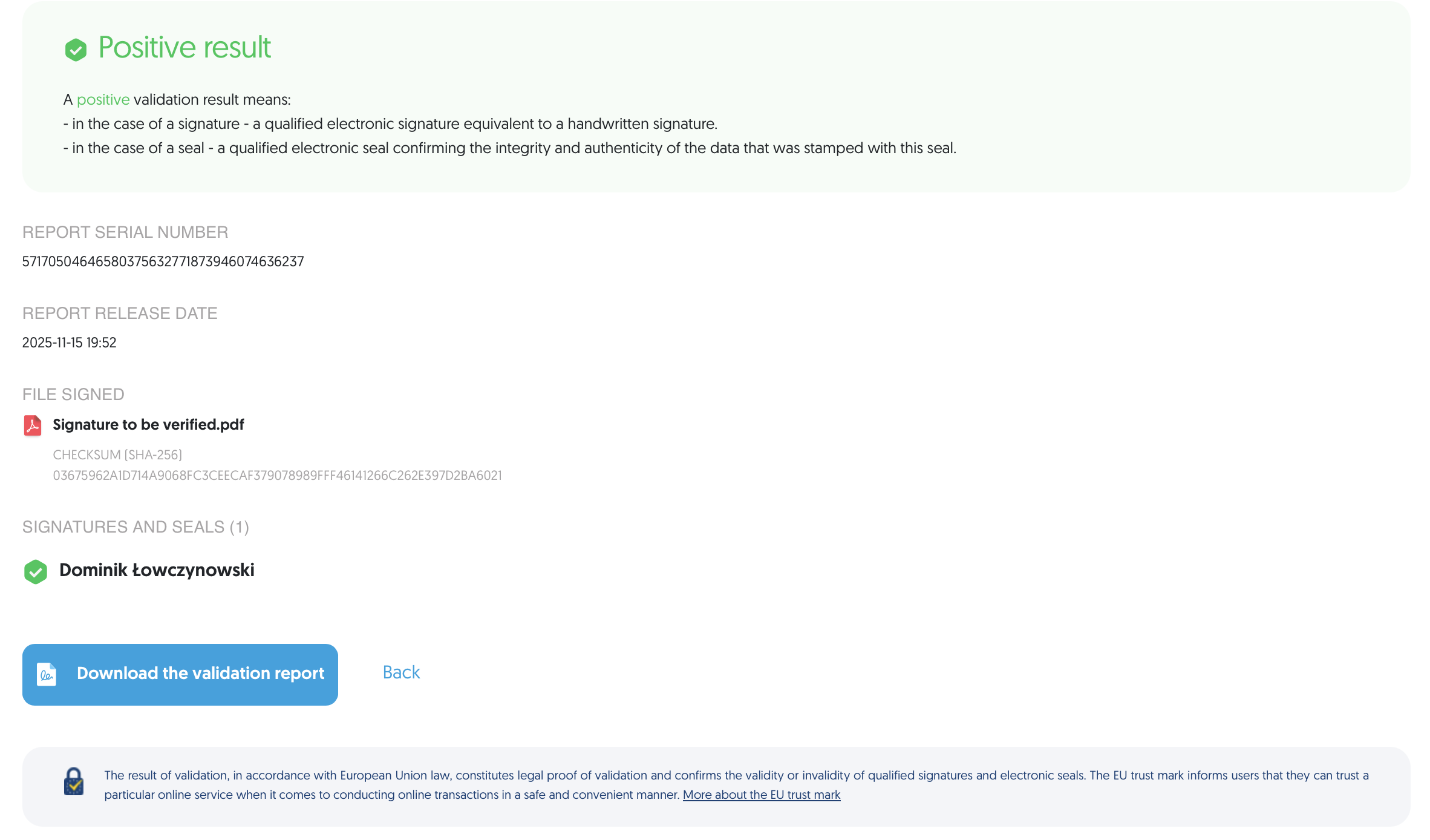 7. After a moment, the result of the qualified validation will appear on the screen.A detailed qualified validation report will be downloaded to your device in PDF format.